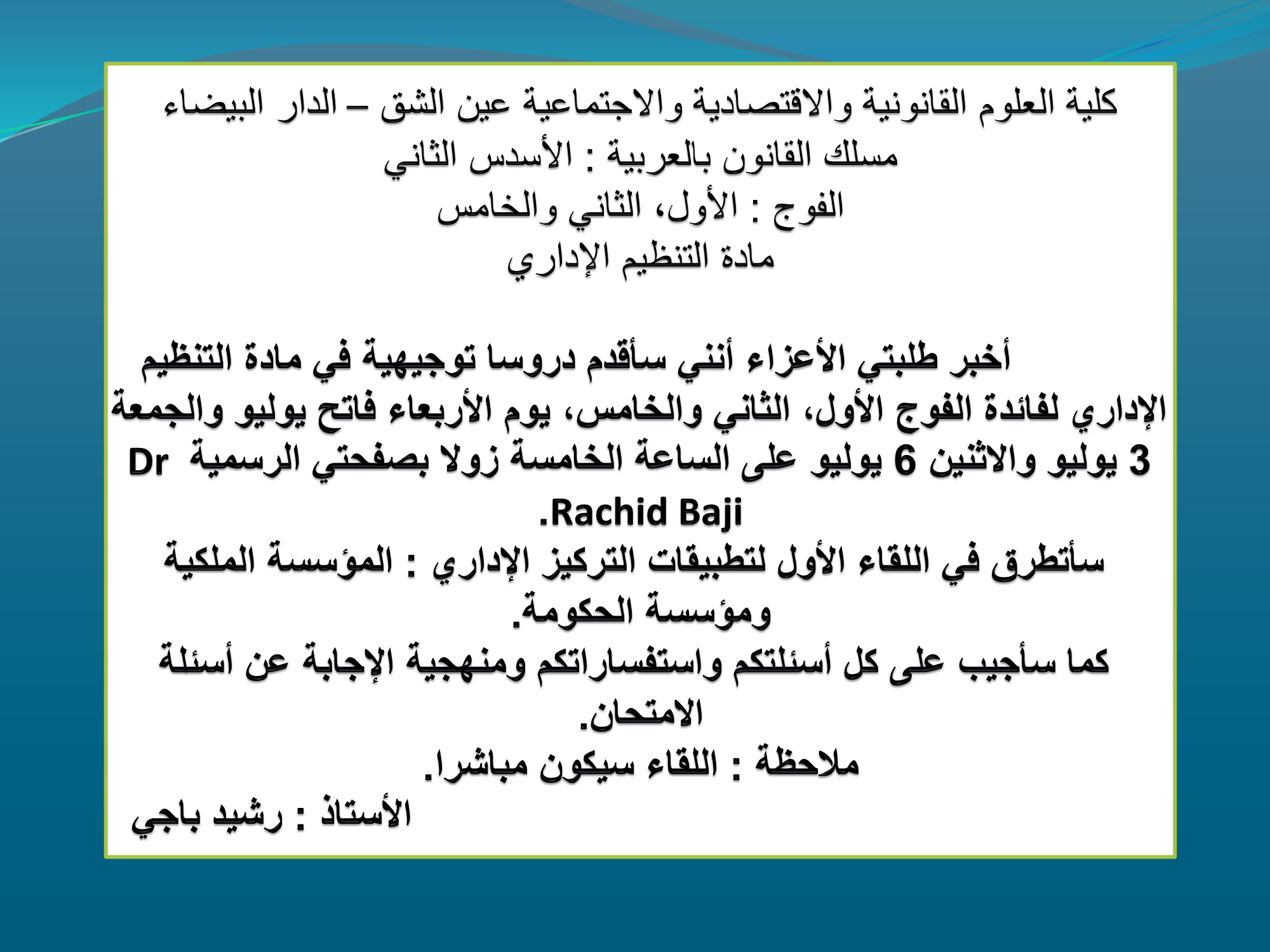 إعلان-بخصوص-االدروس-التوجيهية-في-مادة-التنظيم-الإداريمحاضرة في موضوع نشأة وتطور مؤسسة العامل ومكانتها على المستوى الاقليمي محاضرة في موضوع اختصاصات العامل على ضوء مقتضيات دستور 2011 دمؤسسة الحكومة في التنظيم الإداري المغربي التنظيم الاداري الاسدس الثاني محاضرات في المادة مباشرة على صفحتي على الفيسبوك كل يوم السبت على الساعة الخامسة زوالا |