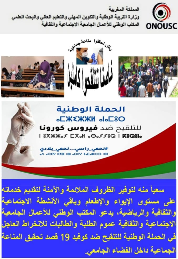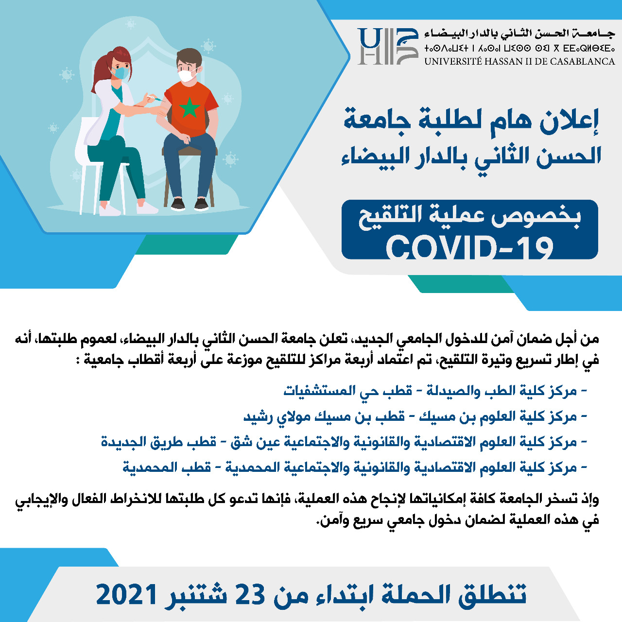 مساهمة من كليتنا في تعميم تلقيح طلبتنا ، يسرنا أن نحيط علما جميع الطلبة الغير الملقحين إلى حد الآن، أن مؤسستنا ستحتضن خلال الايام المقبلة مركز مخصص لتلقيح طلبتنا.
